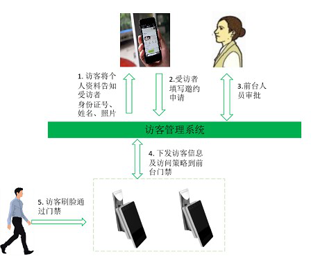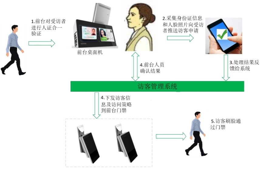 首先受訪者通過手機 APP 將訪客相關資料(姓名、身份證號、照片)錄入訪客管理系統,并生成訪客申請單,前臺審批后,系統自動將該人員的信息及訪問策略下發到前臺門禁設備。該人員按照預定時間可以直接刷人臉通過前臺門禁,進入大廳。常規應用場景下,訪客只能在前臺大廳和會議室活動,無法進入內部辦公區域。