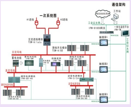 該系統(tǒng)對電源進行全面整合:將交流電源系統(tǒng)、直流電源系統(tǒng)、逆變電源系統(tǒng)、通信電源系統(tǒng)統(tǒng)一設計、監(jiān)控、生產(chǎn)、調(diào)試、服務;通過一體化監(jiān)控模塊將電源各子系統(tǒng)通信網(wǎng)絡化,實現(xiàn)電源信息共享,建立智能電源軟件平臺;通過將電源所有開關智能模塊化,集中功能分散化,實現(xiàn)模塊外無二次接線,無跨屏二次電纜,建立數(shù)字化電源硬件平臺;一體化監(jiān)控模塊通過以太網(wǎng)接口、IEC61850規(guī)約與上位機系統(tǒng)通信,使電源系統(tǒng)成為開放式系統(tǒng)。