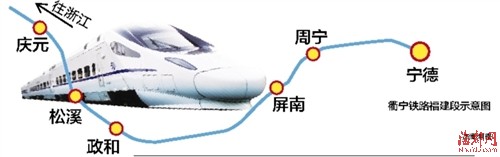 衢寧鐵路共設15個車站,位于浙西南和閩東北地區,北起浙江省衢州市,途經龍游、遂昌、松陽、龍泉、慶元進入福建,經松溪、政和、建甌東、屏南、周寧引入沿海鐵路寧德。鐵路正線全長約366.5公里,工程投資預估算總額307億元,建設工期5.5年,國鐵Ⅰ級標準建設,運輸能力:客車40對/日,貨運6000萬噸/年。