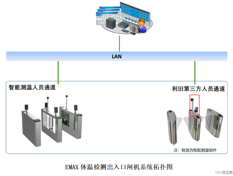 • EMAX英邁斯出入口控制十大品牌,專為疫情設計一套基于測溫人員通道人體測溫篩查的整體解決方案,智能體溫檢測閘機能夠幫助用戶快速發現體溫異常的人員,從而保障工作區域高效管控與人員安全出入。